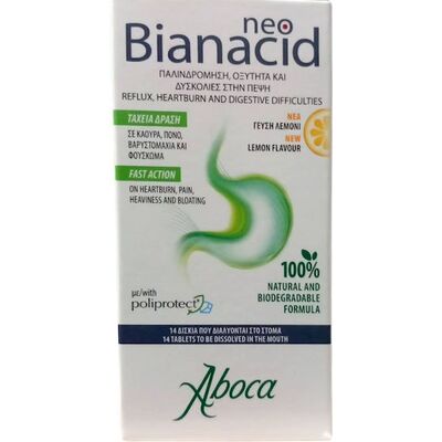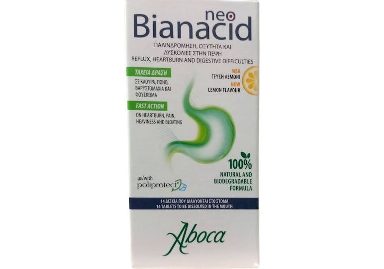 Το NeoBianacid της Aboca είναι ένα φυσικό και με συστατικά βιολογικής γεωργίας ιατροτεχνολογικό προϊόν, που έχει ως βάση το Poliprotect®, ένα σύμπλοκο φυτικών και ανόργανων συστατικών. Είναι πολύ βοηθητικό για άτομα με καούρα, πόνο, βαρυστομαχιά και φούσκωμα.