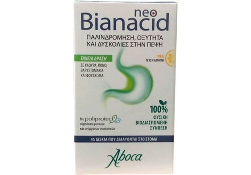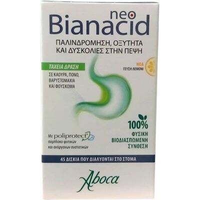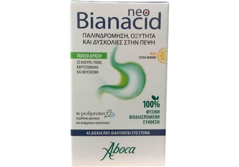 Το NeoBianacid της Aboca είναι ένα φυσικό και με συστατικά βιολογικής γεωργίας ιατροτεχνολογικό προϊόν, που έχει ως βάση το Poliprotect®, ένα σύμπλοκο φυτικών και ανόργανων συστατικών. Είναι πολύ βοηθητικό για άτομα με καούρα, πόνο, βαρυστομαχιά και φούσκωμα.