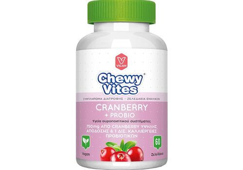 Το Chewy Vites Cranberry + Probio περιέχει έναν συνδυασμό εκχυλίσματος cranberry (πλούσιο σε βιταμίνη C), που προέρχεται από καρπούς υψηλής απόδοσης, καθώς συμβάλλει στην υγεία του ουροποιητικού συστήματος. Περιέχει επίσης 1 δισεκατομμύριο ζωντανές καλλιέργειες, οι οποίες συμβάλλουν στην ενίσχυση του μικροβιώματος του οργανισμού.