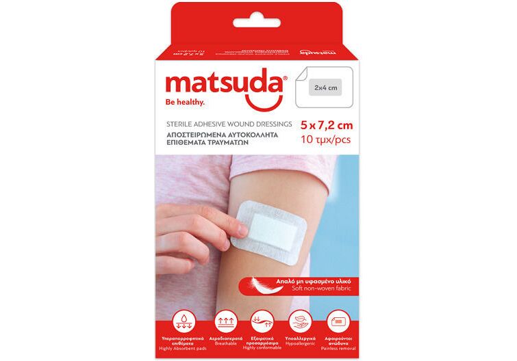 Γάζα Αυτοκόλλητη Αποστειρωμένη Matsuda. Έχει ειδική απορροφητική γάζα με επίστρωση, που βοηθά την απορρόφηση των εκκρίσεων, χωρίς ποτέ να κολλά στην πληγή. Επιτρέπει την αναπνοή του δέρματος.