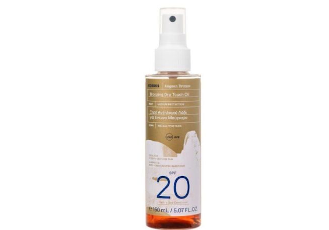 Το Korres Aegean Bronze Bronzing Dry Touch Oil SPF20 είναι ένα ξηρό αντηλιακό λάδι με μεταξένια υφή, για έντονο και ομοιόμορφο μαύρισμα.