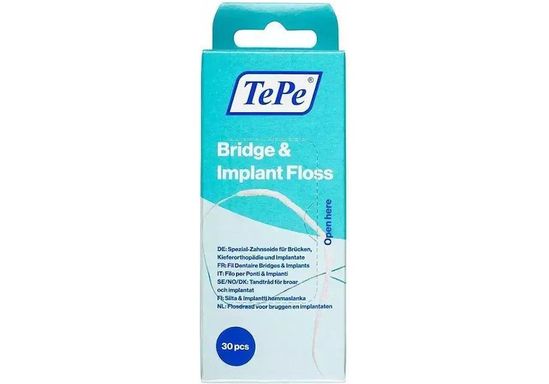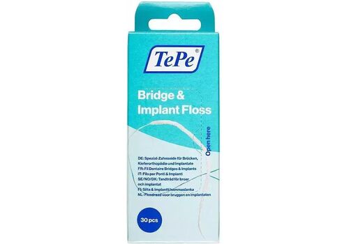Το Tepe Bridge & Implant Floss είναι ένα οδοντικό νήμα που διαθέτει σπογγώδες τμήμα, ειδικά σχεδιασμένο για τον πρακτικό και αποτελεσματικό καθαρισμό των εμφυτευμάτων, των γεφυρών και των ορθοδοντικών συσκευών.