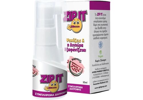 Το Zip It είναι ένα καινοτόμο υπογλώσσιο spray, ιδανικό για να ελέγξετε την όρεξη σας, φτάνοντας στο επιθυμητό βάρος σας. Με ευχάριστη φυσική γεύση Καρπούζι για να καταστέλλει την όρεξη και μειώνει την επιθυμία για τσιμπολογήματα.