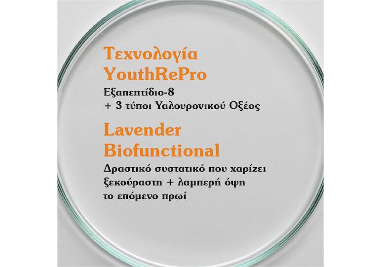 - YouthRePro TECHNOLOGY - Σύμπλεγμα ενεργοποίησης νεότητας με 3 τύπους Υαλουρονικού Οξέος και Εξαπεπτίδιο-8 για λείανση ρυτίδων, ελαστικότητα και σφριγηλό δέρμα.