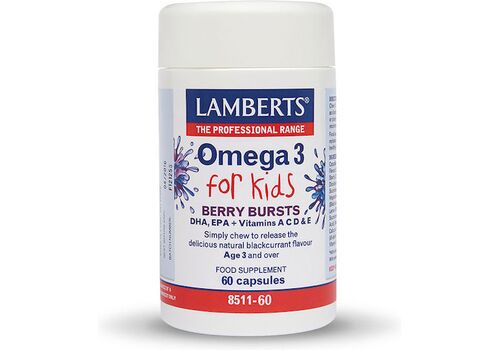 Το προϊόν της Lamberts Omega 3 Berry Bursts, έχει σχεδιαστεί ειδικά για παιδιά 3 ετών και άνω. Μασώντας τη μαλακή κάψουλα απελευθερώνεται μία έκρηξη φυσικής γεύσης βατόμουρου παρέχοντας συγχρόνως απαραίτητα ωμέγα 3 λιπαρά οξέα, σε συνδυασμό με βιταμίνες A, C, D και E.