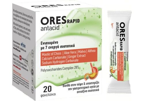 Το ORES RAPID Antacid είναι το ιδανικό συμπλήρωμα διατροφής που βοηθάει στην πέψη, στην ομαλή λειτουργία του στομάχου και προστατεύει τον γαστρικό βλεννογόνο.