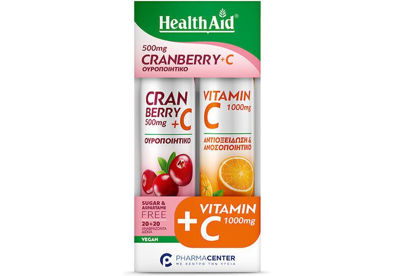 Health Aid Cranberry 500mg + Vitamin C Γεύση Κράνμπερι 20 αναβράζοντα δισκία + Vitamin C 1000mg Πορτοκάλι 20 αναβράζοντα δισκία.