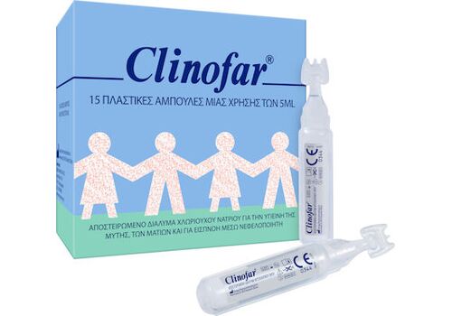 Οι ισότονες αμπούλες Clinofar® περιέχουν αποστειρωμένο, μη ενέσιμο διάλυμα φυσιολογικού ορού, χωρίς συντηρητικά και είναι ασφαλείς, υγιεινές και εύκολες στη χρήση. Είναι κατάλληλες για καθημερινή χρήση σε πολλαπλές ενδείξεις όπως καθαρισμός της μύτης, των ματιών, των αυτιών, των τραυμάτων καθώς και για εισπνοές σε θεραπείες αερολύματος.