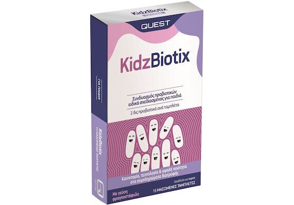Το KidzBiotix της Quest είναι ένα προβιοτικό συμπλήρωμα διατροφής σε μασώμενη μορφή που έχει σχεδιαστεί ειδικά για την καλή λειτουργία του παιδικού εντέρου.