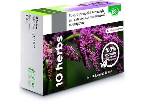 Το φυτικό συμπλήρωμα διατροφής 10 Herbs της ESI περιέχει προσεκτικά επιλεγμένα βοτάνα που η σύνθεσή τουευνοεί την πεπτική λειτουργία και βοηθά στην κανονικότητα του εντέρου.