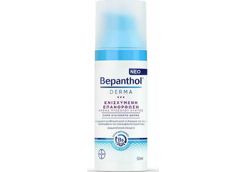Bepanthol Derma Ενισχυμένη Επανόρθωση Κρέμα Προσώπου Νυκτός Ενυδατώστε την επιδερμίδα σας και κατά τη διάρκεια της νύχτας με την Bepanthol® Derma Κρέμα Προσώπου Νυκτός για Ενισχυμένη Επανόρθωση μια, κρέμα προσώπου ενισχυμένης ενυδάτωσης που έχει σχεδιαστεί για να καταπραΰνει την ξηροδερμία, αφήνοντας απαλή και λεία αίσθηση στην επιδερμίδα σας.Η Bepanthol® Derma Κρέμα Προσώπου Νυκτός για Ενισχυμένη Επανόρθωση περιέχει υψηλά επίπεδα φυσικών λιπιδίων για να προσφέρει στο ξηρό δέρμα ενυδάτωση κατά τη διάρκεια της νύχτας και να συμβάλλει στην πρόληψη της μελλοντικής επανεμφάνισης της ξηρότητας. Η ειδική σύνθεση της Η Bepanthol® Derma Κρέμα Προσώπου Νυκτός για Ενισχυμένη Επανόρθωση παρέχει άμεση ανακούφιση στο ξηρό δέρμα και ενεργεί στην υποκείμενη αιτία της ξηρότητας, υποστηρίζοντας τη μακράς διάρκειας προστασία και τη φυσική ανάπλαση του δέρματος.