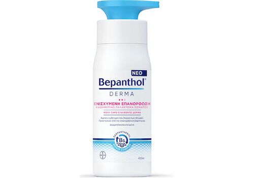 Bepanthol® Derma Ενισχυμένη Επανόρθωση Καθημερινό Γαλάκτωμα Σώματος 400mlΔιατηρήστε ενυδατωμένη την επιδερμίδα σας και νιώστε άμεση ενυδάτωση που διαρκεί έως και 48 ώρες με το Bepanthol® Derma Καθημερινό Γαλάκτωμα Σώματος για Ενισχυμένη Επανόρθωση.Σχεδιασμένo για πολύ ξηρό ευαίσθητο δέρμα, το Bepanthol® Derma Καθημερινό Γαλάκτωμα Σώματος για Ενισχυμένη Επανόρθωση προσφέρει άμεση ανακούφιση στην ξηρή επιδερμίδα. Η πλούσια σύνθεσή του προστατεύει από την επανεμφάνιση της ξηρότητας ενεργώντας στην υποκείμενη αιτία της ξηρότητας, μειώνοντας ορατά την τραχύτητα, τις ξηρές περιοχές του δέρματος και το ρωγμώδες δέρμα.
