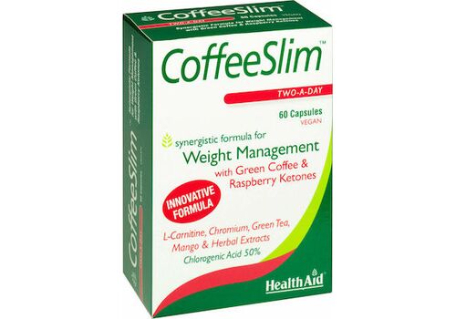 Το Coffee Slim της HealthAid είναι μία πρωτοποριακή σύνθεση με θερμογόνο δράση για τη διαχείριση του υγιούς βάρους. Περιέχει: Εκχύλισμα πράσινου καφέ πλούσιο σε chlorogenic acid που εμποδίζει τη συσσώρευση γλυκόζης στο αίμα, συντελεί στη μείωση βάρους λόγω θερμογενετικής δράσης (φυσικός τρόπος «κάψιμου λίπους»), με ισχυρή αντιοξειδωτική δράση κατά των free radicals (αντιγήρανση, βελτίωση κυκλοφορίας) και του οξειδωτικού στρες. Κετόνες Rasberry που ενισχύουν το μεταβολισμό και το κάψιμου του «επίμονου»λίπους.