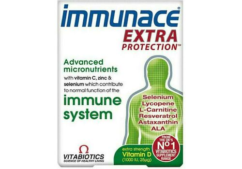 Το Immunace Extra έχει αναπτυχθεί από κορυφαίους επιστήμονες και διατροφολόγους της Vitabiotics για να υποστηρίξει την καθημερινή διατροφή σας, με μεγαλύτερη δόση βιταμίνης D3 (1000IU) συγκριτικά με την αρχική σύνθεση του Immunace. Πρόσφατα, οι επιστήμονες ανακάλυψαν ότι η πρόσληψη υψηλότερης ημερήσιας δόσης βιταμίνης D μπορεί να έχει καλύτερα αποτελέσματα.Οι βιταμίνες A και D συμβάλλουν στη φυσιολογική λειτουργία του ανοσοποιητικού συστήματος. Οι βιταμίνες C και E συμβάλλουν στην προστασία των κυττάρων από το οξειδωτικό στρες. Το Immunace αποτελεί μια καθημερινή πηγή βιταμίνης C η οποία, δεν παράγεται και δεν αποθηκεύεται από τον οργανισμό.