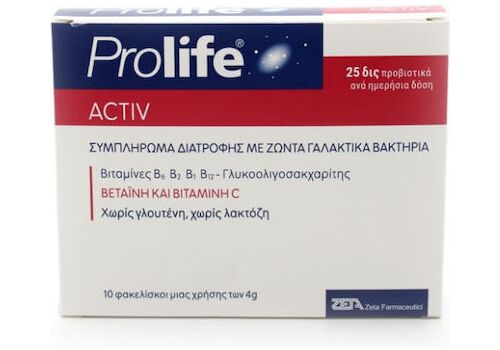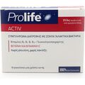 Το Prolife Activ είναι ένα συμπλήρωμα διατροφής με ζώντα γαλακτικά βακτήρια με προβιοτική δράση που ευνοούν την ισορροπία της εντερικής χλωρίδας.Η εντερική μικροχλωρίδα μπορεί να διαταραχθεί λόγω διατροφής, φυσιολογικούς παράγοντες ή από χρήση αντιβιοτικών. Περιέχει βιταμίνες του συμπλέγματος Β. Ειδικότερα, οι βιταμίνες Β6 και Β12 συμβάλλουν στη φυσιολογική λειτουργία του ανοσοποιητικού συστήματος μειώνοντας την κούραση και την κόπωση σε περιόδους πιο έντονης σωματικής και πνευματικής δραστηριότητας, αλλαγής εποχών ή θερμοκρασιακών μεταβολών, ενώ οι βιταμίνες Β1 και Β2 συμβάλλουν στη φυσιολογική λειτουργία των μεταβολικών διεργασιών παραγωγής ενέργειας.