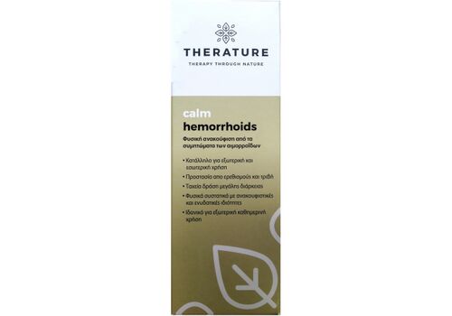 ΧΡΗΣΗ: 1-3 φορές την ημέρα ανάλογα με την ένταση των συμπτωμάτων. Το Therature calm Hemorrhoids θα πρέπει να χρησιμοποιείται μετά την αφόδευση σε καθαρή και στεγνή περιοχή. Τοποθετήστε μία μικρή ποσότητα (στο μέγεθος ενός φασολιού) σε ένα από τα δάχτυλά σας και στη συνέχεια να απλώστε το προϊόν στην περιοχή που υποφέρει, είτε εξωτερικά είτε εσωτερικά. Σε περιπτώσεις εξωτερικών αιμορροΐδων, που δεν αιμορραγούν, πρέπει να εφαρμόζετε 2-3 φορές την ημέρα. Σε καμία περίπτωση δεν πρέπει να χρησιμοποιείται σε ανοιχτές ή αιμορραγικές πληγές. Όταν συνδυάζεται με άλλο τοπικό φάρμακο, το Therature calm Hemorrhoids πρέπει να παραμένει στις αιμορροΐδες για 2 ώρες (τουλάχιστον) πριν από την εφαρμογή του άλλου προϊόντος. Να μην χρησιμοποιείται σε περίπτωση υπερευαισθησίας σε ένα ή περισσότερα από τα συστατικά του.