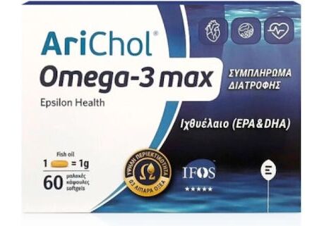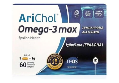 Το συμπλήρωμα διατροφής συμπυκνωμένου ιχθυελαίου Arichol Omega-3 max της Epsilon Health έχει υψηλή περιεκτικότητα σε πολυακόρεστα Ωμέγα-3 λιπαρά οξέα. Είναι ιδιαίτερα πλούσια πηγή ΕPA και DHA, τα οποία θεωρούνται ευεργετικά για την πρόληψη, αλλά και την αντιμετώπιση πολλών προβλημάτων υγείας του σύγχρονου τρόπου ζωής.