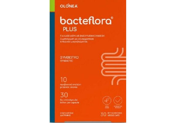 Το BacteFlora PLUS είναι συμβιωτικό συμπλήρωμα διατροφής υψηλής συγκέντρωσης 10 προβιοτικών ειδών, με 30 δισεκατομμύρια προβιοτικά βακτήρια ανά κάψουλα και ινουλίνη, μια πρεβιοτική φυτική ίνα που φτάνει άπεπτη στο έντερο και χρησιμοποιείται ως τροφή από τα φιλικά βακτήρια. Ο συνδυασμός προβιοτικών και πρεβιοτικών ονομάζεται συμβιωτικό. Το BacteFlora PLUS είναι ένα συμβιωτικό προϊόν με plus δράση .