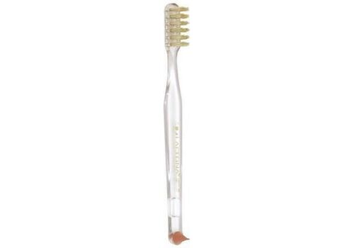 Σκληρή οδοντόβουρτσα της εταιρείας Lactona σε μπεζ χρώμα, η οποία καθαρίζει αποτελεσματικά τα δόντια και αφαιρεί την πλάκα.
