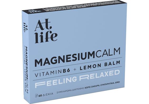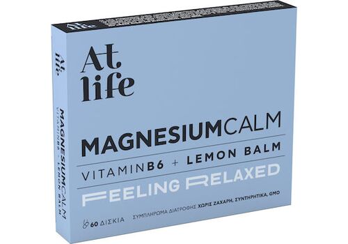 To Αt Life Μagnesium Calm περιέχει Μαγνήσιο και τη Βιταμίνη Β6 που συμβάλλουν στη φυσιολογική λειτουργία του νευρικού συστήματος, στη φυσιολογική ψυχολογική λειτουργία και στη μείωση της κούρασης και της κόπωσης.