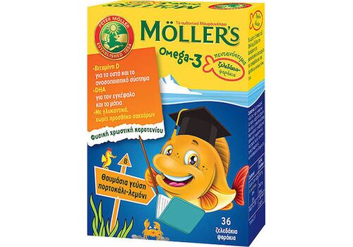 Τα Ψαράκια Ωμέγα-3 της Möller’s είναι νοστιμότατα ζελεδάκια πλούσια σε ωμέγα-3 λιπαρά οξέα και φυσική βιταμίνη D. Η βιταμίνη D προάγει την απορρόφηση του ασβεστίου και του φωσφόρου στο σώμα, συμβάλλει στην φυσιολογική ανάπτυξη των οστών στα παιδιά και υποστηρίζει το ανοσοποιητικό σύστημα. Τα ωμέγα-3 λιπαρά οξέα DHA και EPA είναι απολύτως απαραίτητα για την εύρυθμη λειτουργία του οργανισμού. Το DHA συμβάλλει στην καλή λειτουργία του εγκεφάλου και της όρασης.1