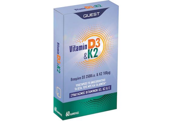 To Vitamin D3 & K2 της Quest παρέχει 2500i.u. βιταμίνης D στην ιδανική μορφή της χοληκαλσιφερόλης σε συνδυασμό με 100μg βιταμίνη Κ, για την υποστήριξη του ανοσοποιητικού συστήματος, των οστών, των δοντιών και των μυών. Το συμπλήρωμα διατροφής Vitamin D3 & K2 της Quest περιέχει 2500i.u. (62,5μg) βιταμίνη D στην δραστική μορφή της D3, που είναι γνωστή και ως χοληκαλσιφερόλη και 100μg βιταμίνης Κ ως μενακινόνη Κ2 στη δραστική μορφή της ΜΚ-7. Οι βιταμίνες D3 και Κ2 δρουν συνεργιστικά για τη διατήρηση της καλής κατάστασης των οστών.