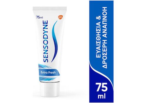 Η Sensodyne Extra Fresh είναι μια οδοντόκρεμα για καθημερινή χρήση, ειδικά σχεδιασμένη για να παρέχει 24ωρη ανακούφιση από την ευαισθησία* των δοντιών. Περιέχει παράγοντα απευαισθητοποίησης, ο οποίος δεν επιτρέπει στο ζεστό, στο κρύο, στο γλυκό ή ακόμα και στην οδοντόβουρτσά σας να ερεθίσουν το νεύρο και να προκαλέσουν πόνο. Επειδή δρα βαθιά μέσα στο δόντι, δε χρειάζεται να ανησυχείτε ότι θα απομακρυνθεί όταν τρώτε ή πίνετε. Απομακρύνει την πλάκα* και περιέχει φθόριο για να προστατεύει από την τερηδόνα.