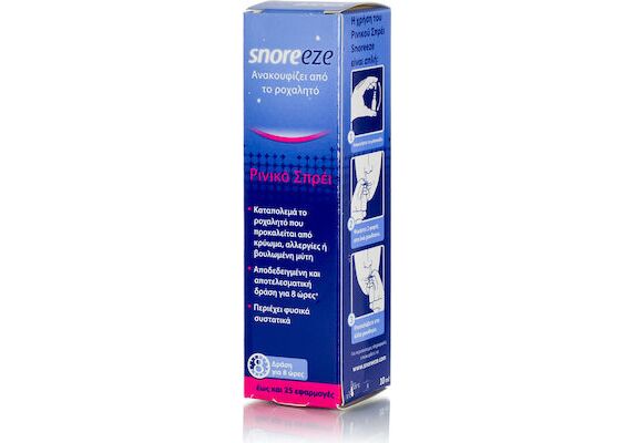 Το Snoreeze Nasal Spray καταπολεμά το ροχαλητό που προκαλείται από κρύωμα, αλλεργίες ή βουλωμένη μύτη. Ο μοναδικός συνδυασμός φυσικών ενεργών συστατικών επικαλύπτει τις ρινικές οδούς και ανοίγει τους αεραγωγούς προσφέροντας αποτελεσματική ανακούφιση από το ροχαλητό για έως και 8 ώρες.