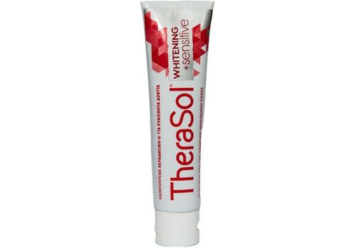 Οδοντόκρεμα της Therasol, η οποία βοηθά στην πρόληψη της πλάκας, ενώ ταυτόχρονα λευκαίνει και ανακουφίζει από την ευαισθησία των δοντιών. Τα ειδικά συστατικά που περιέχει, εξαλείφουν τα υπολείμματα τροφής και αντιμετωπίζουν τις δυσχρωμίες και τις κηλίδες των δοντιών. Παράλληλα, δρα κατά της φθοράς του σμάλτου που περιβάλλει τα δόντια και έχει ως αποτέλεσμα την έκθεση του εσωτερικού τους, που προκαλεί το αίσθημα της ευαισθησίας.