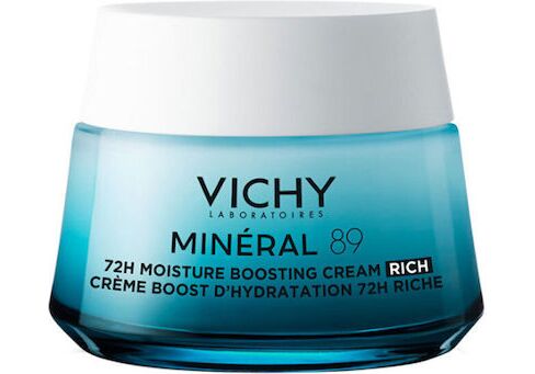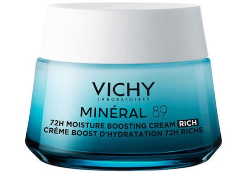 Κρέμα ενυδάτωσης Mineral 89 της Vichy, που αναπληρώνει τα επίπεδα λιπιδίων της επιδερμίδας, επαναφέρει τη λειτουργία του επιδερμικού φραγμού και εξασφαλίζει ενυδάτωση έως και 72 ώρες. Η πλούσια, κρεμώδης υφή της βοηθά στη θρέψη και την καταπράυνση, ενώ αφήνει ένα μεταξένιο άγγιγμα στο δέρμα.
