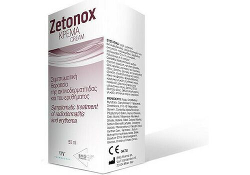 Η κρέμα Zetonox δημιουργεί έναν πολύ λεπτό φυσικό φραγμό, ο οποίος απομονώνει το δέρμα από το γύρω περιβάλλον, βοηθώντας έτσι στην εξασφάλιση ευνοϊκών συνθηκών για τη διατήρηση ή/και την αποκατάσταση της φυσιολογικής δερματικής στιβάδας στην περίπτωση του ερυθήματος, ειδικότερα σε ασθενείς που υποβάλλονται σε ακτινοθεραπείες.
