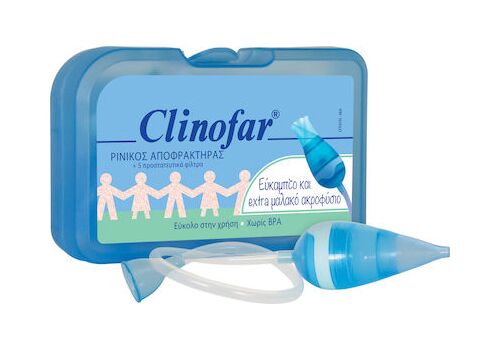 Τα μικρά παιδιά δεν ξέρουν πώς να φυσούν τη μύτη τους και είναι επιρρεπή στο να αναπτύσσουν αρκετές λοιμώξεις το χρόνο. Για να μην αναφέρουμε όλες αυτές τις δυσάρεστες μικρές ενοχλήσεις που προκαλεί η βουλωμένη μύτη στην καθημερινότητα: απώλεια όρεξης, άστατος ύπνος, κλάμα και ανήσυχες νύχτες…Ο Ρινικός Αποφρακτήρας Clinofar® ενδείκνυται για την ανακούφιση της ρινικής συμφόρησης σε περίπτωση κρυολογήματος ή ρινοφαρυγγίτιδας καθώς και για καθημερινή υγιεινή.Στη συσκευασία περιλαμβάνονται επίσης ανταλλακτικά φίλτρα που κατακρατούν τη βλέννα.