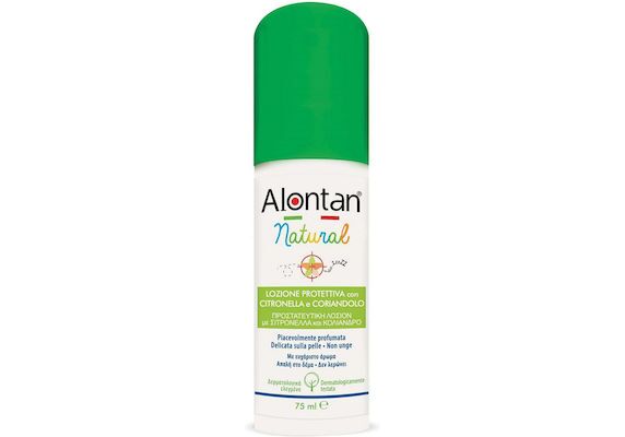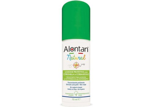 Η Alontan Natural είναι μία λοσιόν σε σπρέι χωρίς προωθητικά αέρια, χωρίς αλκοόλη, με φυσικά εκχυλίσματα από τα φυτά σιτρονέλλα, κόλιανδρο, γεράνι, θυμάρι και λεβάντα που διατηρούν το δέρμα απαλό και ευχάριστα αρωματισμένο.