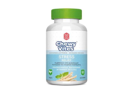 Chewy Vites STRESS RELIEF contain Ashwagandha and Valerian, ingredients that help to deal with stress, as well as vitamins B6 & B12.H vitamin B6 contributes to the normal functioning of metabolic processes that aim to produce energy and reduce tiredness and fatigue.The vitamin B12 contributes to the normal function of the immune and nervous system, as well as normal psychological function. p>