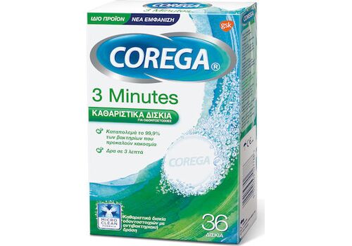 < Dentures are about 10 times softer than your natural teeth, and cleaning them with regular toothpaste can scratch their surface, creating areas where bacteria can grow. Corega 3 Minutes cleaning tablets help you clean your dentures in a better way than toothpaste*, as they do not contain abrasive substances, so they clean without scratching. In just 3 minutes, they fight 99.9% of odor-causing bacteria* and help remove plaque and stains when used as directed. So you can keep your dentures cleaner, fresher and brighter.- It works in 3 minutes.