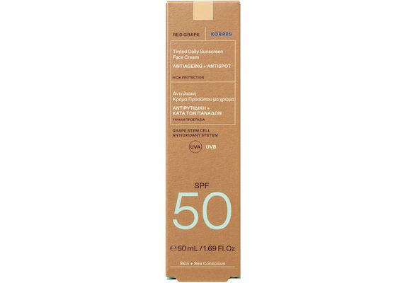 Η Αντηλιακή Κρέμα με Χρώμα με κόκκινο σταφύλι SPF50+ της Korresπροστατεύει από το ευρύ φάσμα της ακτινοβολίας UVA/UVBκαι έχει κλινικά αποδεδειγμένη δράση κατά των ρυτίδων και των πανάδων.