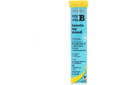 Το SUSTENIUM My Vita B Boosts My Mood αποτελεί μια ενισχυμένη φόρμουλα με φυτικά εκχυλίσματα και βιταμίνες του συμπλέγματος Β, όπως Β6, που συμβάλλει στην ψυχική υγεία του οργανισμού, Χολίνη, και βιταμίνες Β1, Β2, Β3, Β6, Β7, Β12 που συμβάλλουν στη φυσιολογική λειτουργία του νευρικού συστήματος. Περιέχει βιταμίνες του συμπλέγματος Β στο 100% της συνιστώμενης ημερήσιας πρόσληψης οι οποίες βοηθούν σε καταστάσεις στρες και δίνουν ένα boost ενέργειας! Επιπλέον περιέχει Μαγνήσιο που συμβάλλει στη φυσιολογική ψυχολογική λειτουργία. Η σύνθεση εμπλουτίζεται με εκχύλισμα Ashwagandha. Κατάλληλο για άτομα: