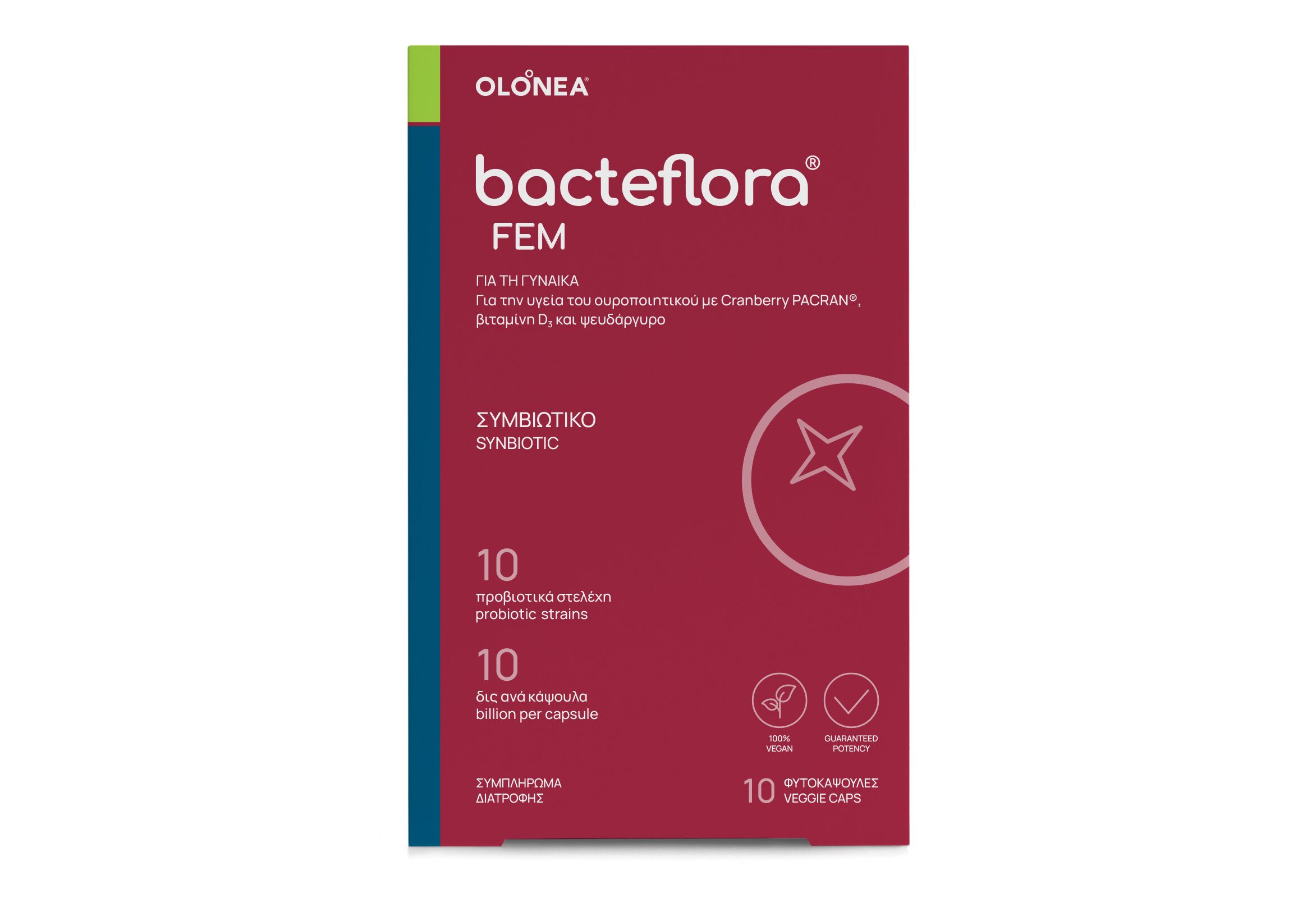 OLONEA bacteflora FEM με προβιοτικά, πρεβιοτικά, cranberry PACRAN, βιταμίνη D3 και ψευδάργυρο για προφύλαξη από ουρολοιμώξεις, 10 φυτοκάψουλες