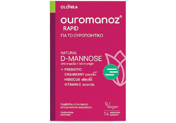 Το Olonea Ouromanoz Rapid είναι ένα καινοτόμο συμπλήρωμα διατροφής με φυσική D-μαννόζη από σημύδα, πρεβιοτικό κόμμι ακακίας, cranberry PACRAN®, ιβίσκο Ellirose™ και βιταμίνη C από ασερόλα.