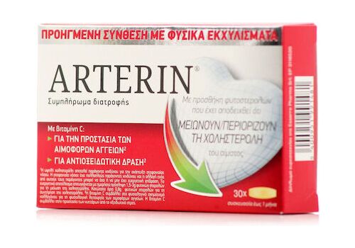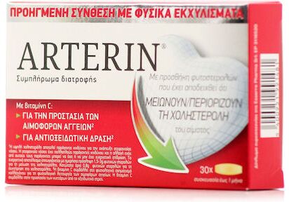 Γι 'αυτό το Arterin® είναι ένα αποτελεσματικό και καλά ανεκτό συμπλήρωμα διατροφής, που δημιουργήθηκε για άτομα που θέλουν να διαχειρίζονται αποτελεσματικά τα επίπεδα της χοληστερόλης τους ως μέρος ενός υγιεινού τρόπου ζωής. Με βάση φυσικά εκχυλίσματα και αντιοξειδωτικά, για τη μείωση και/ή τη διατήρηση της χοληστερόλης.