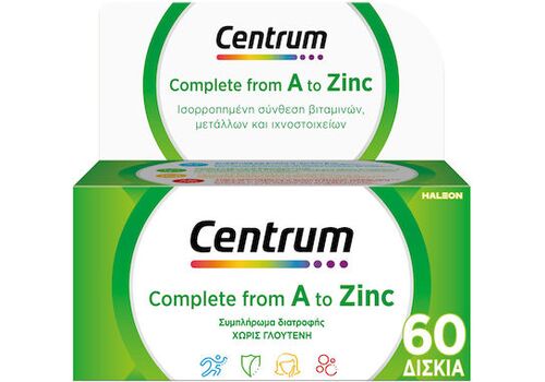Το Centrum A to Zinc περιέχει όλες τις απαραίτητες βιταμίνες, μέταλλα και ιχνοστοιχεία στις απαιτούμενες ποσότητες για τη διατροφική υποστήριξη του οργανισμού. Ένα δισκίο Centrum ημερησίως βοηθά στην κάλυψη των αναγκών για βιταμίνες και μέταλλα. Εύκολο στη λήψη, όπου και όποτε το χρειαστείτε. Κατάλληλο για ενήλικες, άνδρες και γυναίκες.