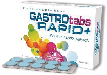 Το Gastro Tabs Rapid+ είναι ένα αντιόξινο συμπλήρωμα διατροφής σε μορφή ταχέως διαλυόμενων δισκίων με την τεχνολογία Rapid Tabs.Διαλύεται σε λιγότερο από ένα λεπτό βοηθώντας στην άμεση ανακούφιση από την καούρα και την δυσπεψία.