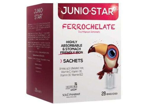 Το Junio Star Ferrochelate είναι ένα παιδικό συμπλήρωμα με σύμπλοκο χηλικού σιδήρου-αμινοξέων για την γρήγορη απορρόφηση του σιδήρου. Επίσης, περιέχει βιταμίνες του συμπλέγματος Β και βιαταμίνη C.