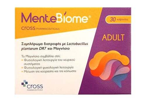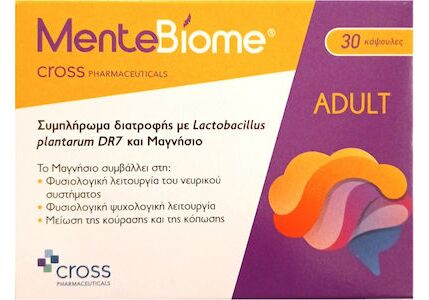 Το Mentebiome® Adultτης Cross Pharmaceuticals είναι συμπλήρωμα διατροφής αποτελούμενο από ένα εξειδικευμένο προβιοτικό στέλεχος, και ειδικότερα τον LactobacillusPlantarumDR7, και μαγνήσιο. Περιέχει ένα 1 δισεκατομμύριoζώντες μικροοργανισμούς από τον L.PlantarumDR7 και 56mgμαγνησίου συμβάλλοντας στησυναισθηματική ισορροπίακαι στη φυσιολογική λειτουργία του νευρικού συστήματος, και μειώνο-ντας το άγχος και το στρεςτην κούραση και την κόπωση.