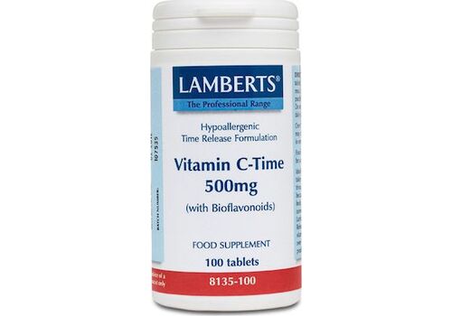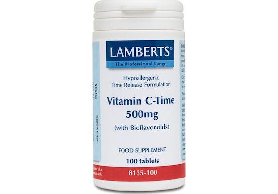 To σκεύασμα Vitamin C Time Release 500mg της Lamberts παρέχει εγγυημένα 500mg Βιταμίνης C σε δισκία ελεγχόμενης αποδέσμευσης και μία σημαντική ποσότητα βιοφλαβονοειδών (ρουτίνη, κερσετίνη, κιτρίνη και εσπεριδίνη) τα οποία συμβάλλουν στην απορρόφησή της από τον οργανισμό και σκόνη καρπών αγριοτριανταφυλλιάς (Rose Hips). Όπως όλα τα σκευάσματα της Lamberts, παρασκευάζεται εντός του Ηνωμένου Βασιλείου σύμφωνα με τα αυστηρά πρότυπα της Φαρμακευτικής GMP (Pharmaceutical GMP).