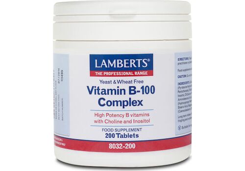 To B-100 Complex της Lamberts, αποτελεί μια εξειδικευμένη διατροφική φόρμουλα υψηλής ισχύος που παρέχει το σύνολο των βιταμινών του συμπλέγματος Β. Αρκετές από τις βιταμίνες του συμπλέγματος Β συμβάλλουν: