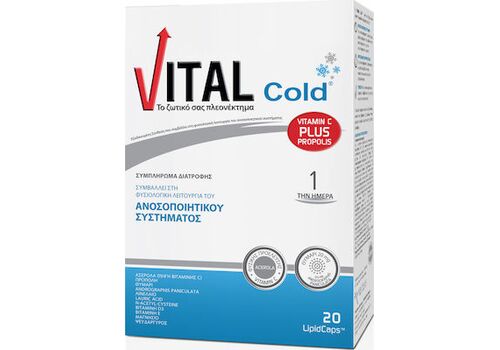 Το Vital Cold® είναι ένα εξειδικευμένο συμπλήρωμα διατροφής σε LipidCaps™, με ολοκληρωμένη επιλογή συστατικών που συμβάλλουν στην φυσιολογική λειτουργία του ανοσοποιητικού συστήματος αλλά και ανακουφίζουν από τα συνήθη συμπτώματα που ταλαιπωρούν τον οργανισμό.