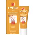 Το Hyfac Sun Protection Dry Touch SPF50+ Tinted έχει ελαφριά, μη λιπαρή, ξηρή υφή που απλώνεται εύκολα και δεν αφήνει λευκά σημάδια
