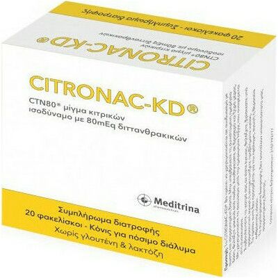 Το Meditrina Citronac-KD 20 αποτελεί ένα συμπλήρωμα διατροφής για την αλκαλοποίηση του οργανισμού. Το Citronac – KD αυξάνει την περιεκτικότητα των διττανθρακικών ιόντων στο πλάσμα του αίματος. Επιπλέον επηρεάζει τη συστηματική οξύτητα και την οξύτητα των ούρων με δοσοεξαρτώμενο τρόπο. (Αποτελέσματα κλινικών μελετών. Δεν αποτελούν γνωμοδότηση του EFSA.)