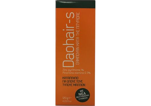 Το Daohair-S είναι ένα ειδικά σχεδιασμένο σαμπουάν που συμβάλλει στην καταπολέμηση της πιτυρίδας, του κνησμού και της λιπαρότητας. Προσφέρει στα μαλλιά ιδιαίτερη καθαρότητα, λάμψη και στιλπνότητα. Περιέχει ένα ιδιαίτερα δραστικό συστατικό. το Pyrithione Zinc, με ευρύτατο φάσμα δράσης έναντι θετικών και αρνητικών κατά Gram μικροοργανισμών, όπως βακτηρίδια και μύκητες. Ειδικότερα είναι αποτελεσματικό έναντι διάφορων τριχόφυτων, όπως Trichopyton Mentogrophytes, Tonsurans, Rubrum, Violacedum, Faviforme, Epidermophyton Flocossum, Botrytis Cinera κλπ και χρησιμοποιείται για την απομάκρυνση των μικροβίων από το τριχωτό της κεφαλής.Παράλληλα λόγω των ειδικών καλλυντικών εκδόχων που περιέχει, περιποιείται και διατηρεί τα μαλλιά όμορφα, καθαρά, απαλά και ευκολοχτένιστα.Κατάλληλο για κάθε τύπο μαλλιών, τα διατηρεί όμορφα, καθαρά, απαλά και λαμπερά.Δερματολογικά ελεγμένο.